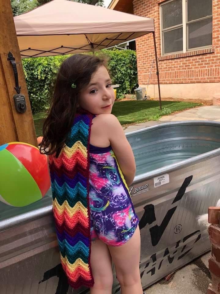 You look at us as though this is the most normal lace to be – in a backyard with people, a dog and goats. A tub of water and a tent. A bathing suit and a knitted, rainbow cape.